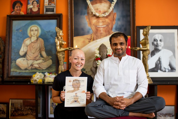 Sara började som lärling hos Ann Svärdfeldt (Auktoriserad L1) år 2011-2013. Sara är sedan år 2016 lärling och assistent hos Isabella Nitschke (Auktoriserad L2). Sara hade sommaren 2018 förmånen att få gå Richard Freeman och Mary Taylors månadslånga Teacher Intensive i Boulder, Colorado, USA. Sara går så ofta hon kan på workshops och utbildningar med erfarna lärare och hon reser så ofta hon har möjlighet till Mysore för att praktisera med sin guru R. Sharat Jois. Hon blev Auktoriserad nivå 1 i januari 2019 och har därmed Sharaths godkännande att lära ut första serien i Ashtanga yoga.